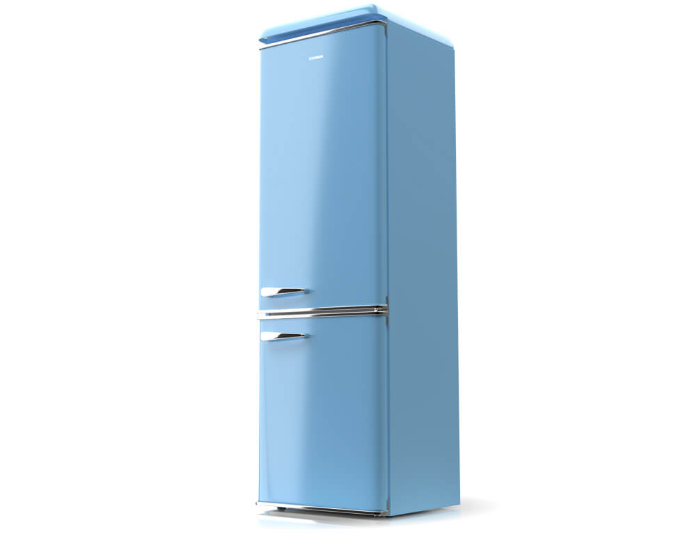 Ψυγειοκαταψύκτης Hyundai HCVG23-310BL με ρετρό σχεδιασμό σε γαλάζιο χρώμα, χωρητικότητα τροφίμων που φθάνει τα 300 λίτρα και υψηλή απόδοση E για εξοικονόμηση ενέργειας.