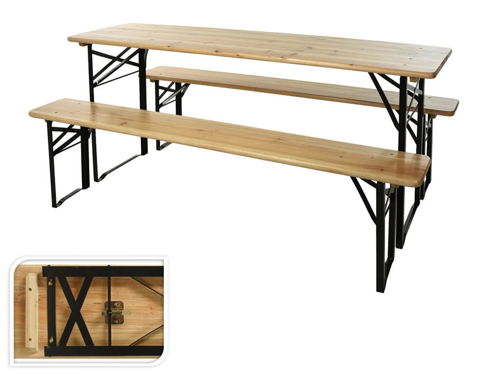 Απολαύστε ένα όμορφο γεύμα στον κήπο ή την βεράντα με την παρέα σας με το σετ πικνικ. Το σετ αποτελείται από ένα τραπέζι και δύο πάγκους σε απόχρωση ξύλου και μαύρα πόδια. Είναι κατασκευασμένο από μέταλλο και είναι ανθεκτικό στο χρόνο και τις ακραίες καιρικές συνθήκες. Η επιφάνεια των πάγκων και του τραπεζιού είναι από ξύλο Cunninghamia, ένα υλικό ανθεκτικό στη διάβρωση, ανθεκτικό στη φθορά και φιλικό προς το περιβάλλον.