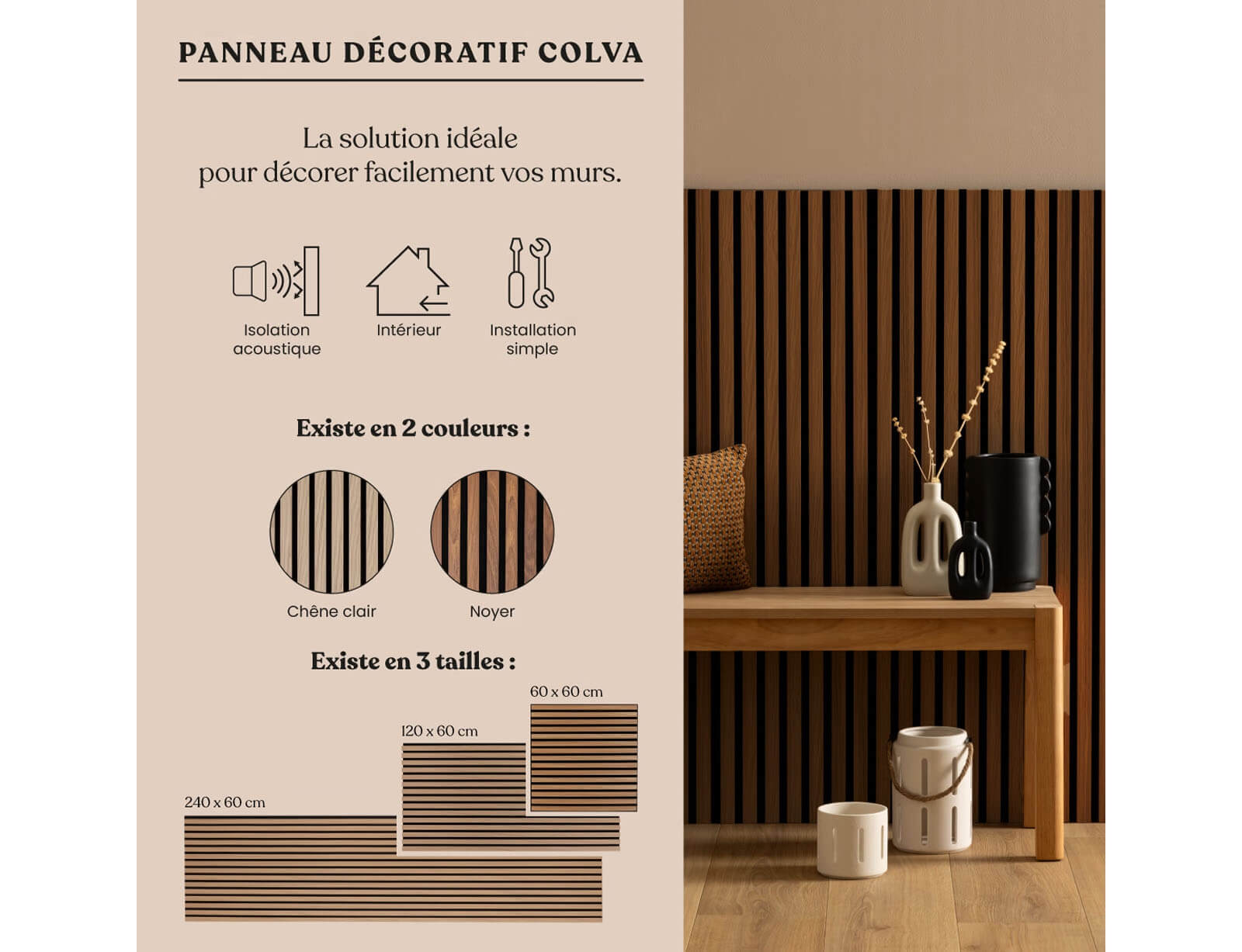 Ανανεώστε το χώρο σας με το 3d πάνελ τοίχου Colva από την Atmosphera. Χάρη στο μοναδικό του σχεδιασμό, το πάνελ προσδίδει μια αίσθηση φυσικότητας, ενώ η τρισδιάστατη δομή του τραβάει τα βλέμματα και δίνει χαρακτήρα σε κάθε τοίχο. Κατασκευασμένο από υψηλής ποιότητας υλικά, το συγκεκριμένο πάνελ προσφέρει ρεαλιστική υφή ξύλου και βάθος, δημιουργώντας μια ζωντανή και ζεστή ατμόσφαιρα στον χώρο σας. Είναι εύκολο στην εγκατάσταση αφού μπορεί να τοποθετηθεί είτε με κόλλα είτε με βίδες. Προσφέρει μερική ηχομόνωση στο χώρο, λόγω της τσόχας που είναι τοποθετημένη στο πίσω μέρος και μπορεί να κοπεί εύκολα.