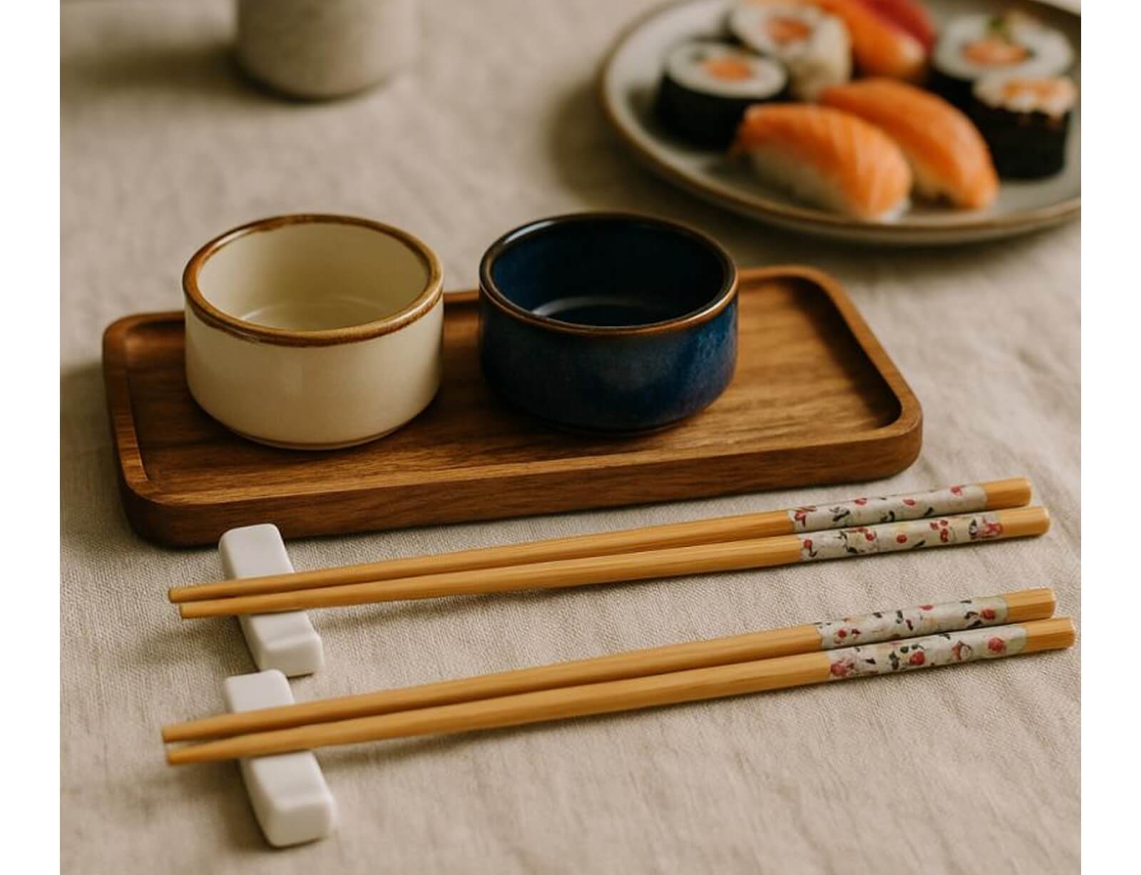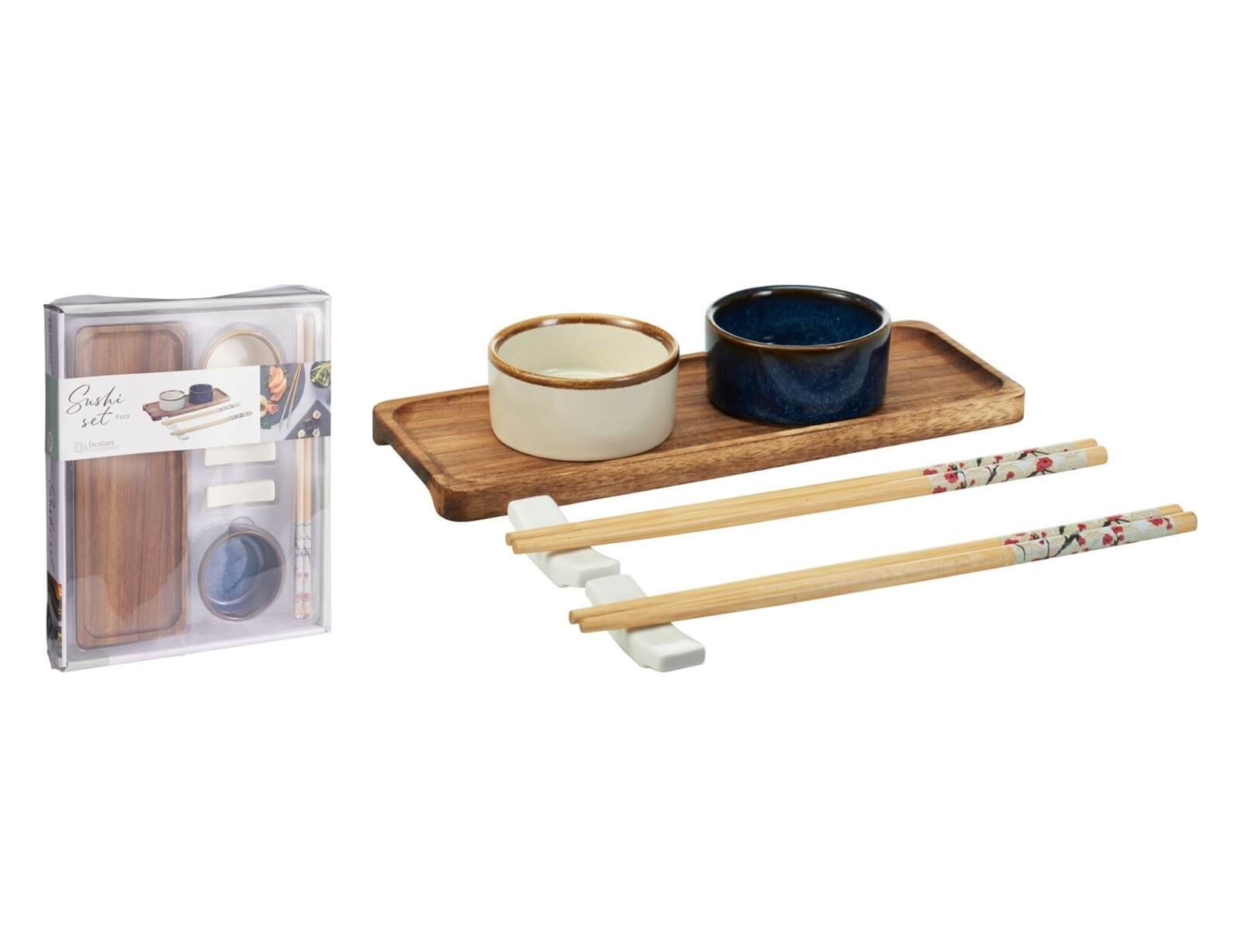 Το σετ σερβιρίσματος Sushi από την Excellent Houseware είναι το ιδανικό εργαλείο για να απολαύσετε τις αυθεντικές γεύσεις του σούσι στο σπίτι σας, με κομψότητα και λειτουργικότητα. Ο δίσκος σερβιρίσματος είναι από ξύλο ακακίας, τα μπολ και οι βάσεις είναι φταγμένα από πορσελάνη ενώ τα chopsticks από ξύλο μπαμπού. Ιδανικό για ρομαντικά δείπνα, γιορτές ή ακόμα και καθημερινές στιγμές απόλαυσης, αυτό το σετ θα μετατρέψει κάθε γεύμα σε μια μοναδική εμπειρία.