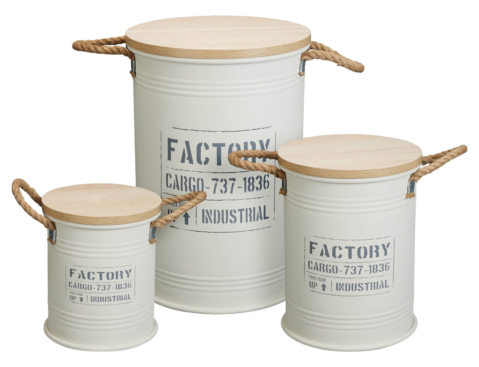 Ανακαλύψτε το σετ αποθήκευσης από σίδηρο, σε κομψό χρώμα κρεμ με βιομηχανικό τύπωμα. Κάθε κομμάτι διαθέτει δύο ανθεκτικά χερούλια από σκοινί και καπάκι MDF, ιδανικό για αποθήκευση και ταυτόχρονα διακόσμηση του χώρου σας. Το σετ περιλαμβάνει μεγάλo, μεσαίο και μικρό κουτί, προσφέροντας πρακτικές λύσεις για κάθε γωνιά του σπιτιού σας.