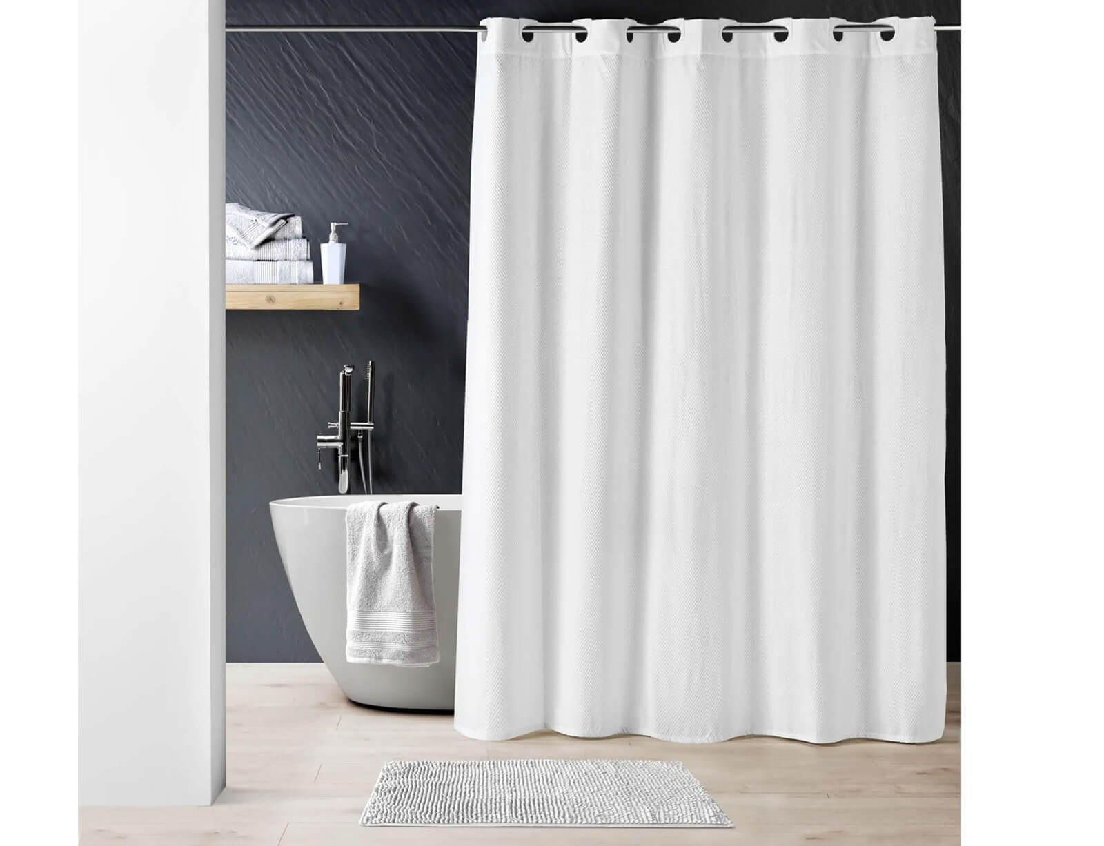 Κουρτίνα μπάνιου από την εταιρεία Douceur d'intérieur που προστατεύει το μπάνιο σας διατηρώντας το καθαρό και στεγνό, ενώ παράλληλα θα δώσει και μια ευχάριστη πινελιά. Είναι κατασκευασμένη από μικροΐνες, με μεγάλη διάρκεια στο χρόνο. Η κουρτίνα θα πρέπει να καθαρίζεται συχνά ώστε να απομακρύνονται μύκητες και μούχλα, ενώ όταν δείτε ότι έχει αρχίσει να κιτρινίζει ή μαυρίζει από τα υπολείμματα σαπουνιού καλό θα είναι να αντικαθίσταται