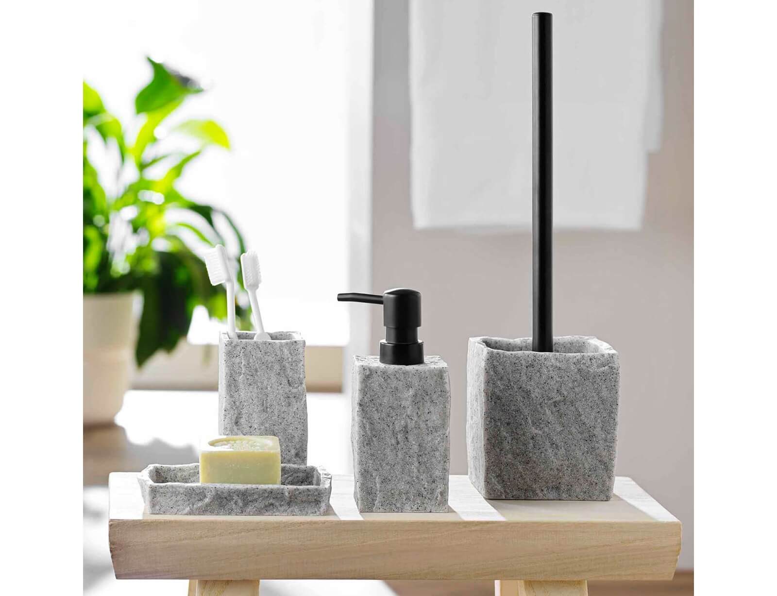 Ποτηροθήκη μπάνιου της εταιρείας Douceur d'intérieur, κατασκευασμένη από Polyresin με όψη πέτρας, η οποία είναι το κατάλληλο αξεσουάρ ώστε να τοποθετείτε τις οδοντόβουρτσες, την οδοντόκρεμα ή οτιδήποτε άλλο χρειάζεται να τακτοποιήσετε. Θα σας βοηθήσει στο να έχετε πάντα ένα οργανωμένο μπάνιο και να επιτυγχάνεται μέγιστη υγιεινή, αφού τα αντικείμενα σας δεν θα είναι εκτεθειμένα οπουδήποτε στον χώρο. Η τοποθέτηση της είναι επικαθήμενη, και καλό θα είναι να τοποθετείται όσο το δυνατόν πιο κοντά στον νιπτήρα ώστε να έχετε άμεση πρόσβαση στο περιεχόμενο.